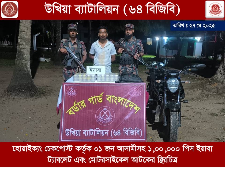 বুধবার (২৭ মে) রাত আনুমানিক সাড়ে ১১টারদিকে হোয়াইক্যং চেকপোস্ট এলাকায় তাকে আটক করা হয়। এসময় তার কাঁধে থাকা ব্যাগ তল্লাশি করে এক লাখ পিস ইয়াবা উদ্ধার করা হয়।