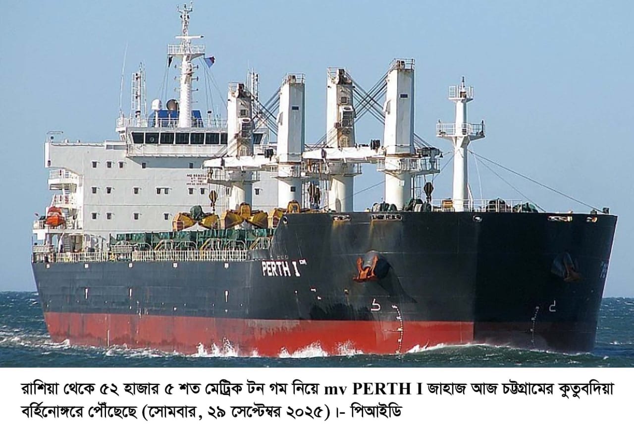মোহাম্মদ খোরশেদ হেলালী, কক্সবাজার প্রতিনিধিঃ বাংলাদেশের খাদ্য নিরাপত্তা জোরদারে গুরুত্বপূর্ণ ভূমিকা রাখতে যাচ্ছে রাশিয়া থেকে আমদানিকৃত নতুন গম চালান। ৫২ হাজার ৫ শত মেট্রিক টন গম নিয়ে MV PERTH I নামের জাহাজ সোমবার (২৯ সেপ্টেম্বর) কুতুবদিয়া বর্হিনোঙ্গরে নোঙর করেছে।
