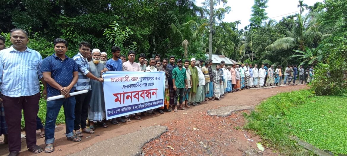 সোনাগাজী উপজেলার মতিগঞ্জ ইউনিয়ন ও আমিরাবাদ ইউনিয়নের সীমান্তবর্তী এলাকায় চানকাজী খাল পুনরুদ্ধারের দাবিতে মানববন্ধন কর্মসূচি পালন করে স্বরাজপুর- আমিরাবাদ ইউনিয়নের পশ্চিম আহম্মদপুর গ্রামের ভুক্তভোগী বাসিন্দারা।