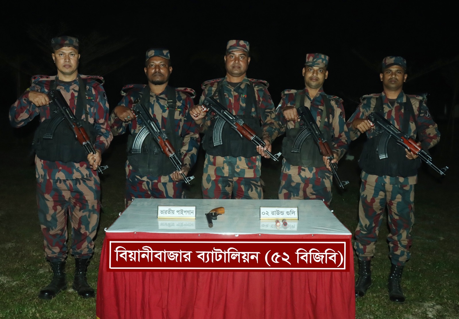বিজিবি সুত্রে জানা যায়, উপজেলার গান্দাইল বিওপির দায়িত্বপূর্ণ সীমান্ত পিলার ১৩৮০ এর নিকট বাংলাদেশের অভ্যন্তরে একটি অস্ত্রের চালান পাচার হবে এমন গোপন সংবাদের ভিত্তিতে তাৎক্ষনিকভাবে গান্দাইল বিওপি হতে একটি বিশেষ টহল দল বর্ণিত স্থানে গমণ করে বিশেষ অভিযান পরিচালনা করে। পরবর্তীতে আনুমানিক ৮ ঘটিকায় সীমান্ত পিলার ১৩৮০ এর হতে ৭০০ গজ বাংলাদেশের অভ্যন্তরে ৫ নং শাহবাজপুর ইউনিয়নের নাটিটিলা নামক স্থানে তল্লাশি অভিযান পরিচালন করে মালিক বিহীন অবস্থায় ১ টি ভারতীয় পাইপগান ও ২ রাউন্ড কার্তুজ উদ্ধার করতে সক্ষম হয়।