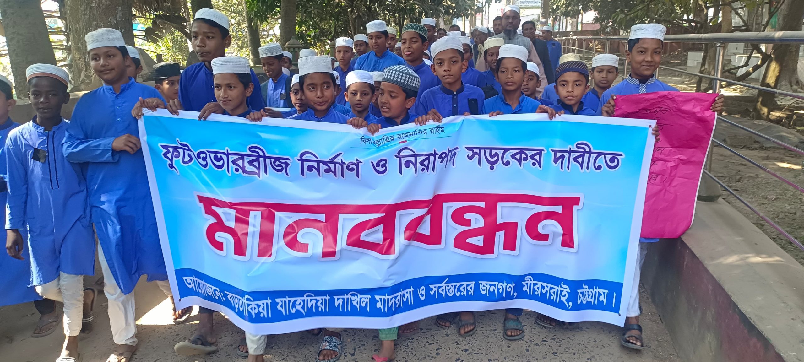 এম জাবেদ হোসাইন | মীরসরাই প্রতিনিধিঃ চট্টগ্রামের মীরসরাইয়ে সড়ক দুর্ঘটনায় মাদ্রাসা শিক্ষার্থী ও অভিভাবক নিহতের প্রতিবাদে ও ফুট ওভারব্রিজের দাবিতে বিশাল মানববন্ধন কর্মসূচি পালন করেছে মাদ্রাসা, স্কুল শিক্ষার্থীরা ব্যবসায়ী ও এলাকাবাসী।
