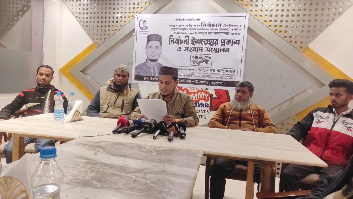 বুধবার সন্ধ্যায় উপজেলার পৌরশহরের ইয়াম্মি প্যারাডাইস রেস্টুরেন্ট এন্ড পার্টি সেন্টারে অনুষ্ঠিত ইশতেহার ঘোষণার লিখিত বক্তব্যে আব্দুন নুর তালুকদার বলেন, ফ্যাসিবাদ বিরোধী আন্দোলনের তিনি একজন সংগঠক, রাষ্ট্র সংস্কার ও নতুন রাজনৈতিক বন্দোবস্ত প্রতিষ্ঠার অঙ্গীকারবদ্ধ কর্মী। জনগণের ভোটে বিজয়ী হয়ে জাতীয় সংসদে শপথ গ্রহণের প্রথম ৩০ দিনের মধ্যেই মৌলভীবাজার-১ আসনকে একটি সন্ত্রাস, চাঁদাবাজ ও দুর্নীতিমুক্ত আদর্শ আসনে রূপান্তরের উদ্যোগ গ্রহণ করবেন। সন্ত্রাস ও দুর্নীতির বিরুদ্ধে তার অবস্থান থাকবে জিরো টলারেন্স। প্রাতিষ্ঠানিক দুর্নীতি ও দুঃশাসনের অবসান ঘটাবেন। খাদ্য নিরাপত্তা ও পুনর্বাসনে প্রতিটি মধ্যবিত্ত ও নিম্ন-মধ্যবিত্ত পরিবারের জন্য সুলভমূল্যে খাদ্য ক্রয়ের লক্ষ্যে একটি করে রেশন কার্ড প্রদান নিশ্চিত করবেন। পরিবহনে শৃঙ্খলা ও ভাড়া নির্ধারণে সব ধরণের পরিবহনের জন্য সুনির্দষ্ট ও বাস্তবসম্মত ভাড়ার তালিকা প্রণয়ন করবেন। নাগরিক অভিযোগ ও সামাজিক সম্প্রীতি, শান্তি ও আস্থা প্রতিষ্ঠায় প্রত্যেকটি গুরুত্বপূর্ণ পয়েন্টে স্থাপন করবেন নাগরিক অভিযোগ বক্স। এছাড়া তরুণদের কর্মসংস্থান ও পর্যটন উন্নয়ন, শ্রমিকদের মর্যাদা ও সুরক্ষায় পর্যায়ক্রমে চালু করবেন শ্রমিক কার্ড। নির্বাচনি ইশতেহার ঘোষণাকালে গণঅধিকার পরিষদ মনোনীত প্রার্থী আব্দুন নুর তালুকদারের সাথে উপস্থিত ছিলেন বদরুল ইসলাম, আব্দুর রহমান, তুহিন আহমদ, কলিম উদ্দিন, আব্দুস সামাদ, সুমন আহমদ সহ দলীয় কর্মী সমর্থকরা।