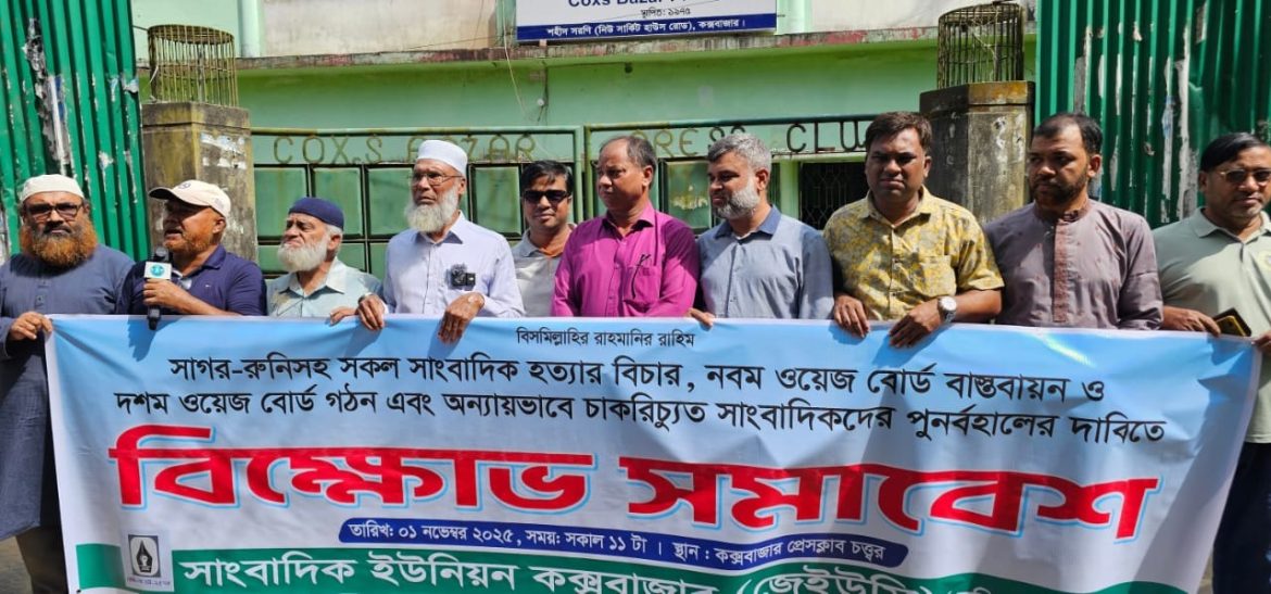 মোহাম্মদ খোরশেদ হেলালী কক্সবাজার প্রতিনিধিঃ সাগর-রুনিসহ সকল সাংবাদিক হ’ত্যার বিচার, নবম ওয়েজ বোর্ড বাস্তবায়ন ও দশম ওয়েজ বোর্ড গঠন এবং চাকুরিচ্যূত সাংবাদিকদের পুণর্বহালের দাবিতে সাংবাদিক ইউনিয়ন কক্সবাজারের বি’ক্ষো’ভ সমাবেশ ও মানববন্ধন অনুষ্ঠিত হয়েছে। ১ নভেম্বর বেলা ১২ টায় কক্সবাজার প্রেসক্লাবের সামনে অনুষ্ঠিত মানববন্ধন ও বিক্ষোভ সমাবেশে সভাপতিত্ব করেন সাংবাদিক ইউনিয়ন কক্সবাজার এর সভাপতি নুরুল ইসলাম হেলালী। সাধারণ সম্পাদক এসএম জাফরের সঞ্চালনায় অনুষ্ঠিত উক্ত বিক্ষোভ সমাবেশে বিভিন্ন দাবিতে বক্তব্য রাখেন কক্সবাজার প্রেসক্লাবের সহ সভাপতি কামাল হোসেন আজাদ, জেইউসির সহ সভাপতি এমআর মাহবুব, টেলিভিশন সাংবাদিক এসোসিয়েশনর সভাপতি এমআর খোকন।