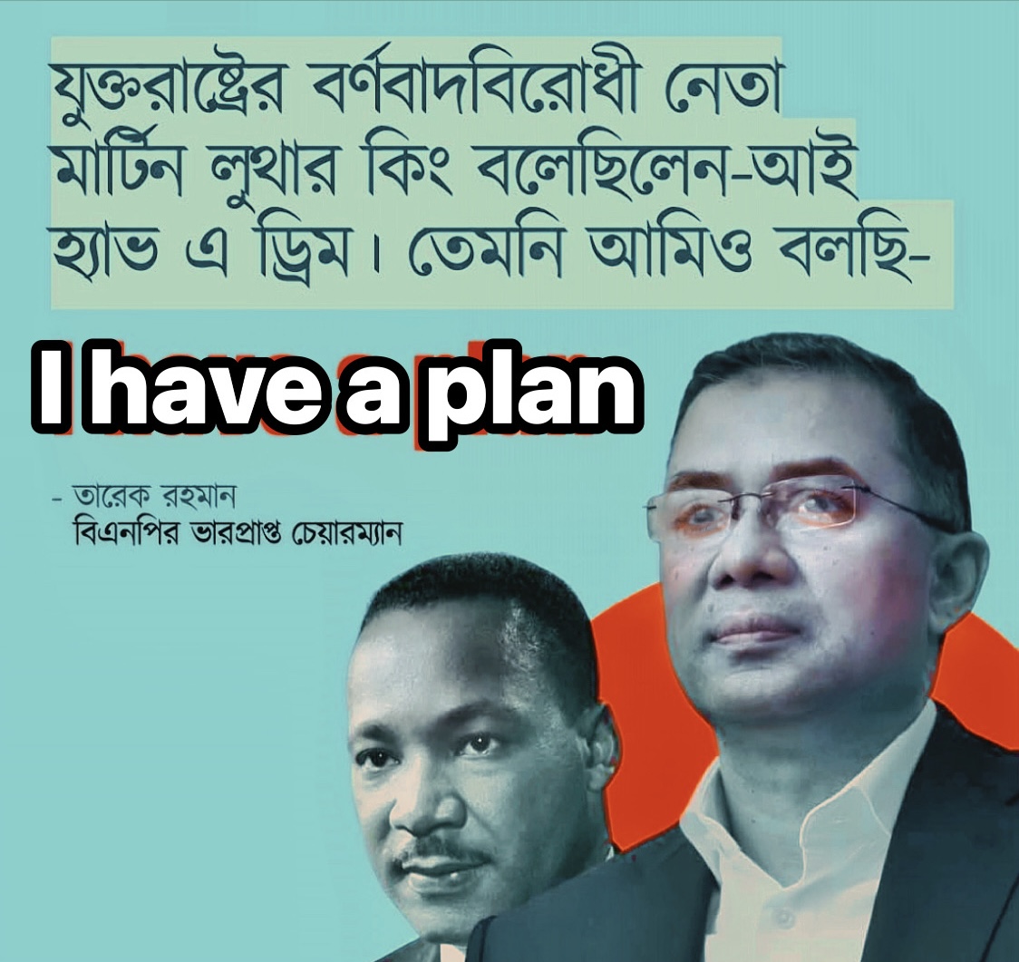 সম্প্রতি প্রকাশিত একটি গ্রাফিক বার্তায় তারেক রহমান বলেন, I have a plan অর্থাৎ তিনি কেবল স্বপ্ন নয়, দেশ পুনর্গঠনের জন্য সুস্পষ্ট পরিকল্পনার কথাও বলছেন। পোস্টারটিতে বর্ণবাদবিরোধী আন্দোলনের প্রেরণাদায়ী নেতা মার্টিন লুথার কিংয়ের বক্তব্যের সঙ্গে তারেক রহমানের এই ঘোষণাকে প্রতীকীভাবে উপস্থাপন করা হয়েছে।