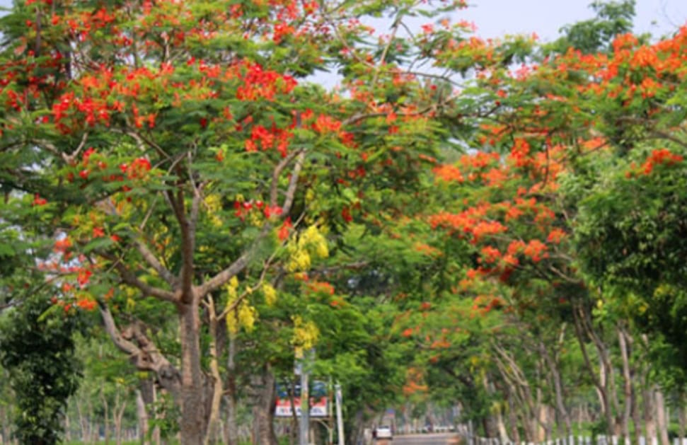 A winding, tarred road passes through the middle of the Bhurbhuria tea garden, the outpost of the Bharaura tea garden. This is the Srimangal-Bhanugachh road. From the slaughterhouse 71 to the Bangladesh Tea Research Institute or BTRI point. On both sides of the road, there are large flowering trees of different species one after another. From a distance, a wonderful view of red, yellow, and golden flowers can be seen. Many other species of flowering trees, including Krishnachura, Radhachura, and others.